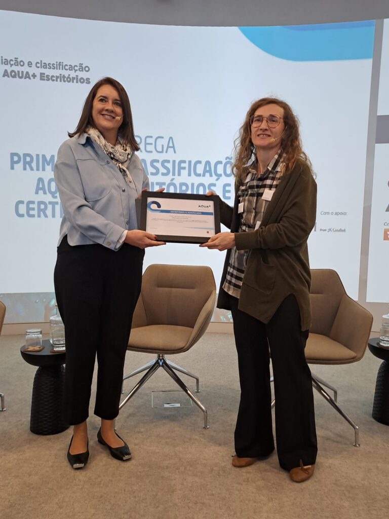 Durante a sessão, que decorreu no BPI All in One Lisboa (Edifício Monumental), foram entregues as Primeiras Classificações AQUA+ Escritórios a três organizações pioneiras, nomeadamente, Edifício LUMNIA- EXEO e a auditora Vanessa Faia da ADENE; Edifício Monumental BPI e a auditora Filipa Newton; e a Ana Poças que recebeu o Diploma do LNEC, onde é também auditora do Departamento de Hidráulica.