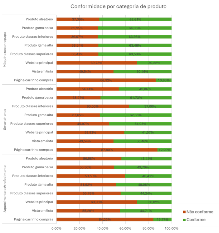 - A categoria de produtos de aquecimento e arrefecimento, apesar de manter as etiquetas energéticas desde a sua entrada em vigor, apresenta menor taxa de conformidade quanto à disponibilidade dessas etiquetas.